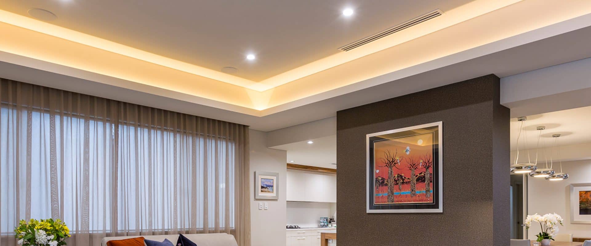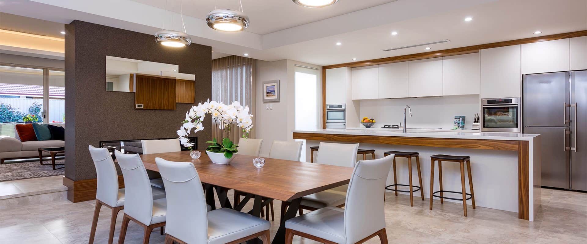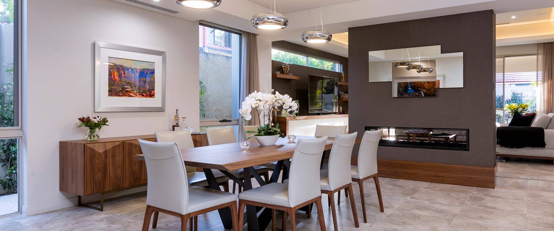The elegant dining and living spaces, separated by a modern double-fronted gas fireplace, seamlessly extend outdoors to a spacious alfresco area equipped with built-in kitchen facilities.
