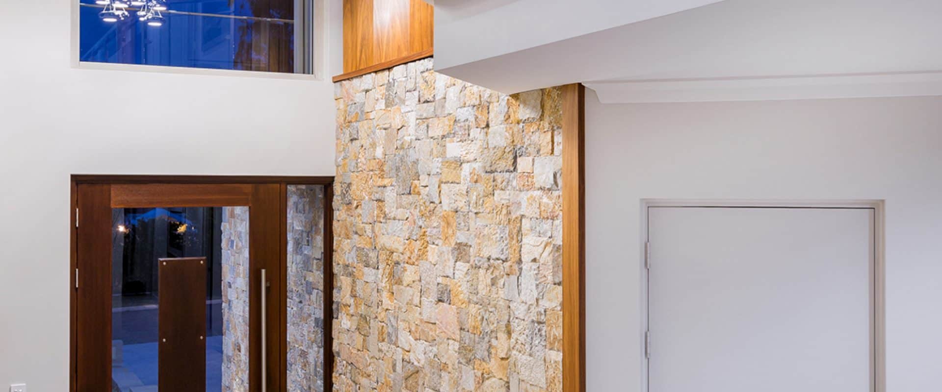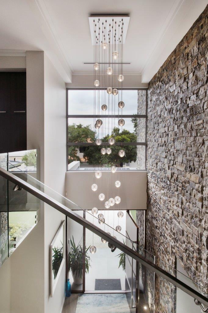 Perfectly at home in a modern setting, this home features a timber-lined ceiling and a distinctive stacked stone wall that continues inside to the impressive foyer, where the glass and stainless steel staircase takes off from its marble base to the upper floor.